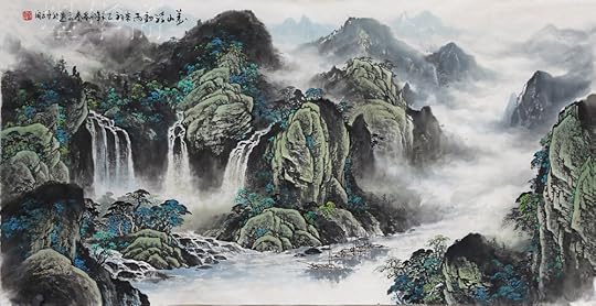 Landscape watercolor by artist Qin Yun. Our eye can linger over rhythm of line, mass, space, light and shade, color.
