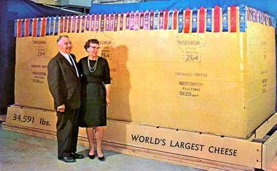 Donald Barthelme lets us know in the history of swallowing there’s one case study which can perhaps prove instructive: the enormous piece of cheese the state of Wisconsin contributed to the 1964-1965 New York World Fair. In keeping with the long-standing Americanism that bigger is better, Wisconsin’s prize entry (as pictured below) tops the scales at nearly 35,000 pounds. Now that’s one gargantuan hunk of cheese. So much for subtlety and nuance. By the way, the reason for its cuboid shape rather than the more traditional cylindrical is strict pragmatics: eighteen tons of cheese in the shape of a disk would be simply too wide to fit on a truck or train.