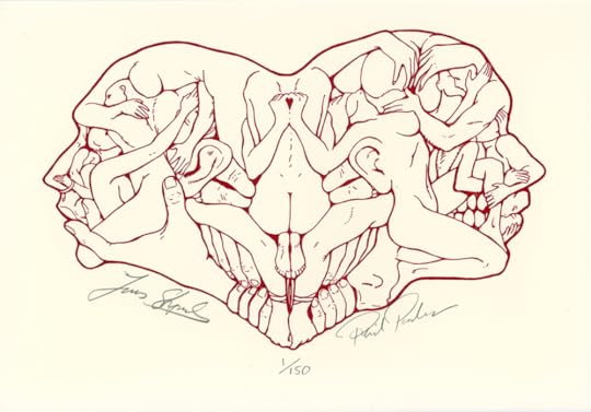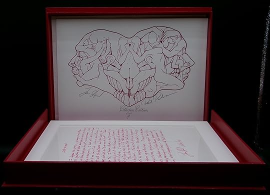 A note from the publisher of the limited-edition of this Lucius Shepard novella reads: "We tried something different for this book, the book is bound in dark red material with cream stamping, and the pages are printed in dark red on cream stock. Tom Joyce wrote an excellent essay on collecting Lucius Shepard’s books. The lithograph is signed by Lucius Shepard and Phil Parks and was included with all editions. Lucius Shepard hand wrote the beginning of a short story for the collector’s edition. Each of these stories is different." And the limited-edition showcases the above art that captures the pulse of this intense work of fiction.